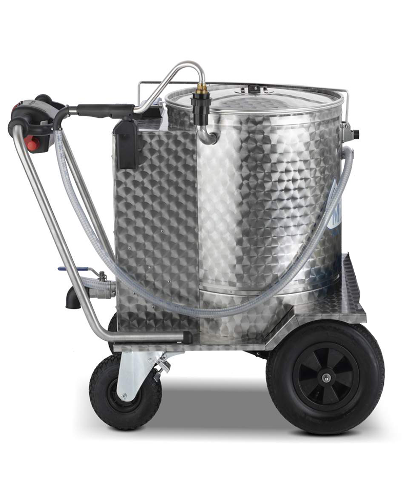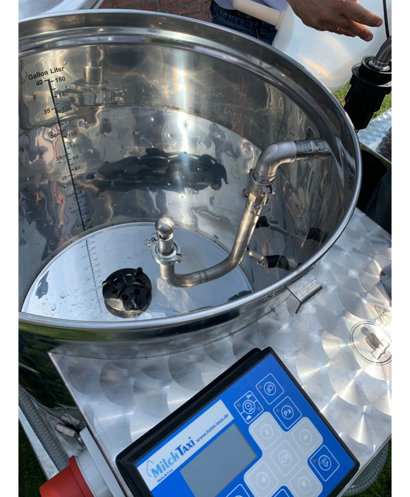 Configuratie echipament: Milk Taxi din INOX prevazut cu capac, Far iluminare drum cu lumini LED, Robinet golire cu iesire 1 1/4″, Agitator puternic, Termometru incorporat, Manere ergonomice, Meniu in limba romana, Pompa INOX cu brat pivotant pentru dozarea laptelui cu reglarea cantitatii dozate, Sistem de recirculare pentru spalare, Patru roti ce au cauciucuri cu aer (400mm / 250 mm), Frana