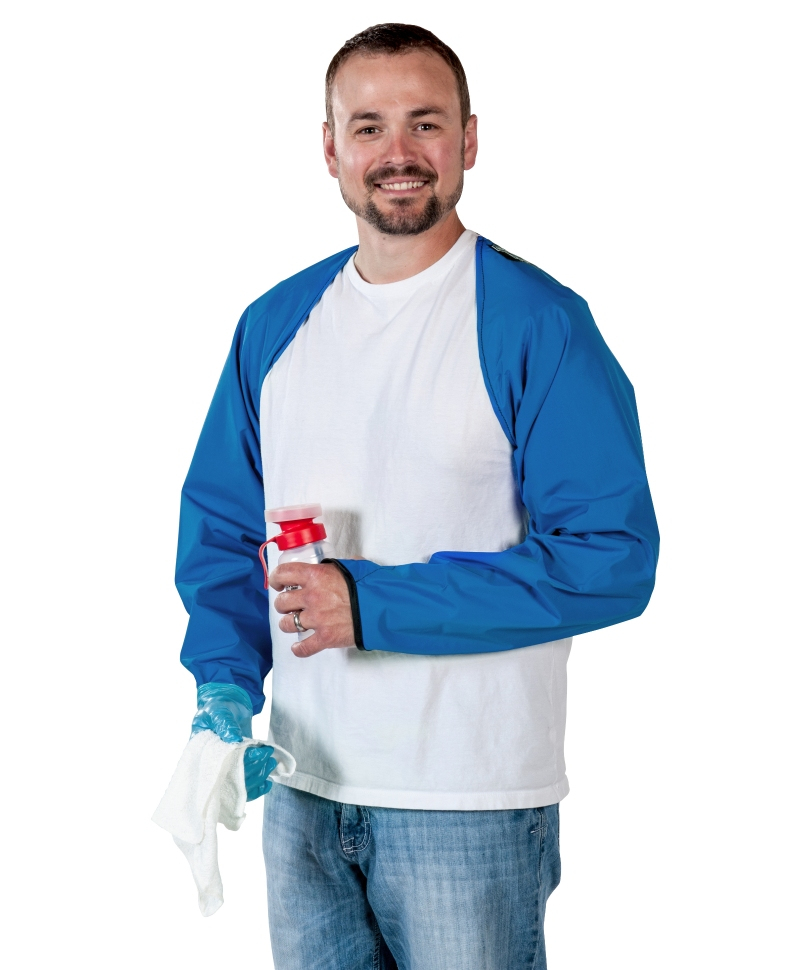 Manecile protejeaza umerii si bratele, fara sa alunece in jos. Design-ul unic al gaurii pentru degetul mare ajuta la ancorarea manecii in manusa pentru a impiedica apa sau solutiile de dipare sa ajunga pe piele.