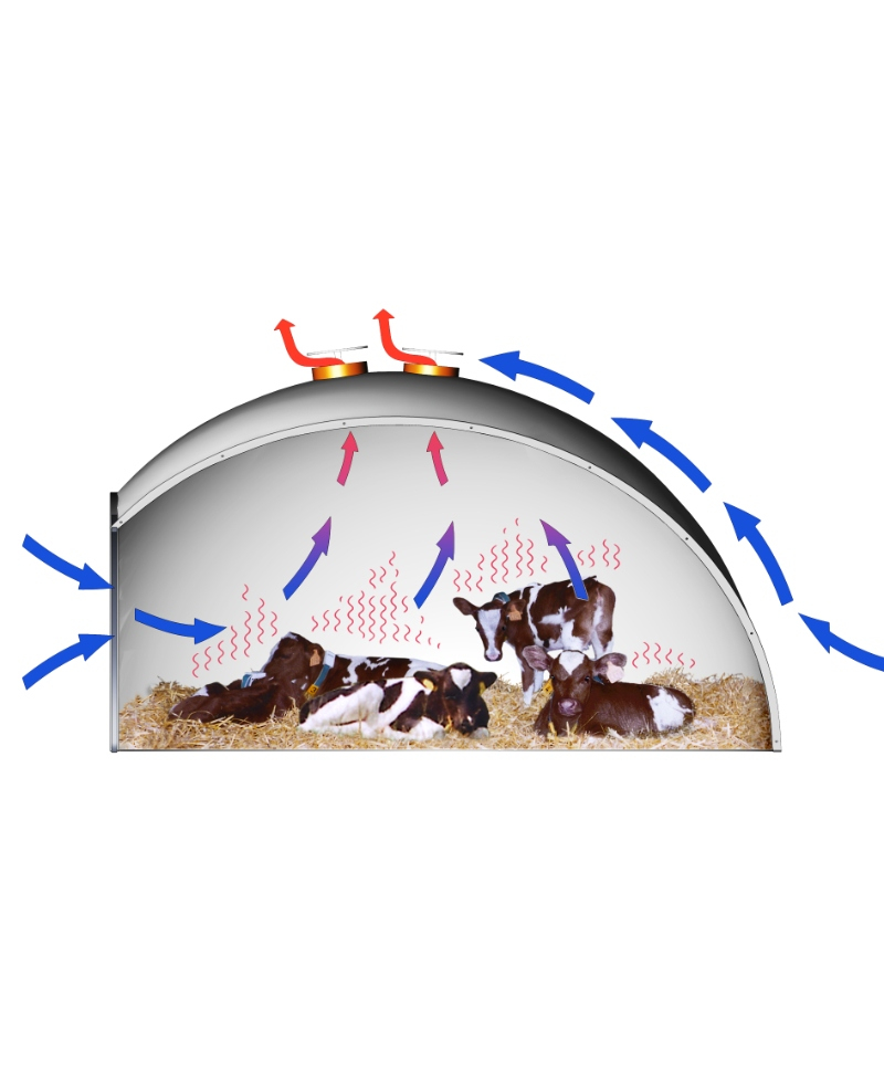 Este bine cunoscut faptul ca formarea curentilor in zona de odihna provoaca stres viteilor tai si ii poate imbolnavi. Cu toate acestea, adaposturile conventionale pentru vitei au nevoie de un debit de aer ridicat pentru a asigura circulatia si pentru a elimina aerul statut si contaminat cu bacterii. In special, viteii care au doar cateva saptamani nu sunt capabili sa se descurce cu acest efect nedorit cauzat de producerea de caldura a corpului lor. Cu o boxa comuna spatioasa H&L Igloo, oferi viteilor un spatiu fara curent, dar totusi foarte bine ventilat.