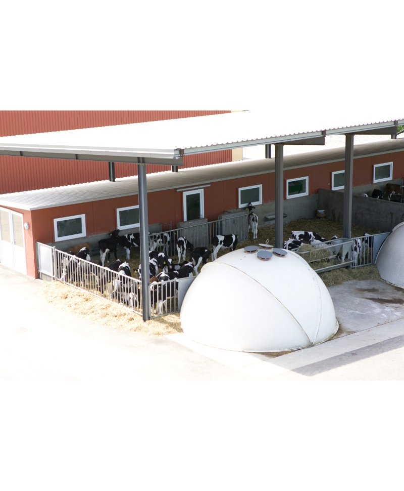 Boxa comuna pentru vitei tip iglu pentru adapostirea a maxim 15 vitei asigura un mediu natural de crestere in aer liber, asigurand protectie impotriva razelor solare si impotriva frigului in sezonul rece.