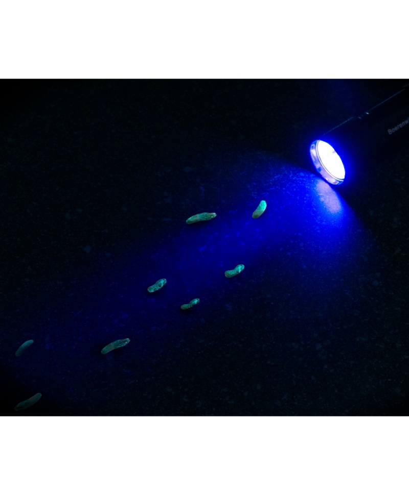 Lanterna este ideala pentru detectarea petelor de fecale si urina lasate de soareci si sobolani dupa ce au consumat momeala cu ingrediente fluorescente.