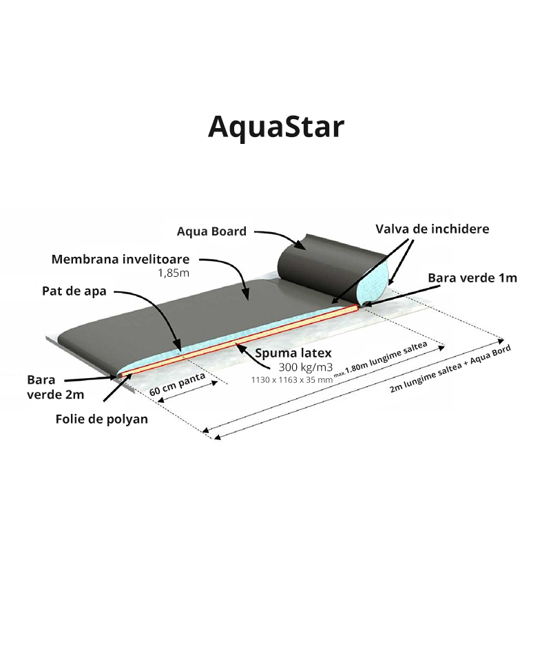 AquaStar este salteaua pe pat de apa cu un design exclusiv cu canale care ajuta la evacuarea lichidelor si la eliminarea umiditatii, fiind usor de curatat, cu o fixare complet ermetica.