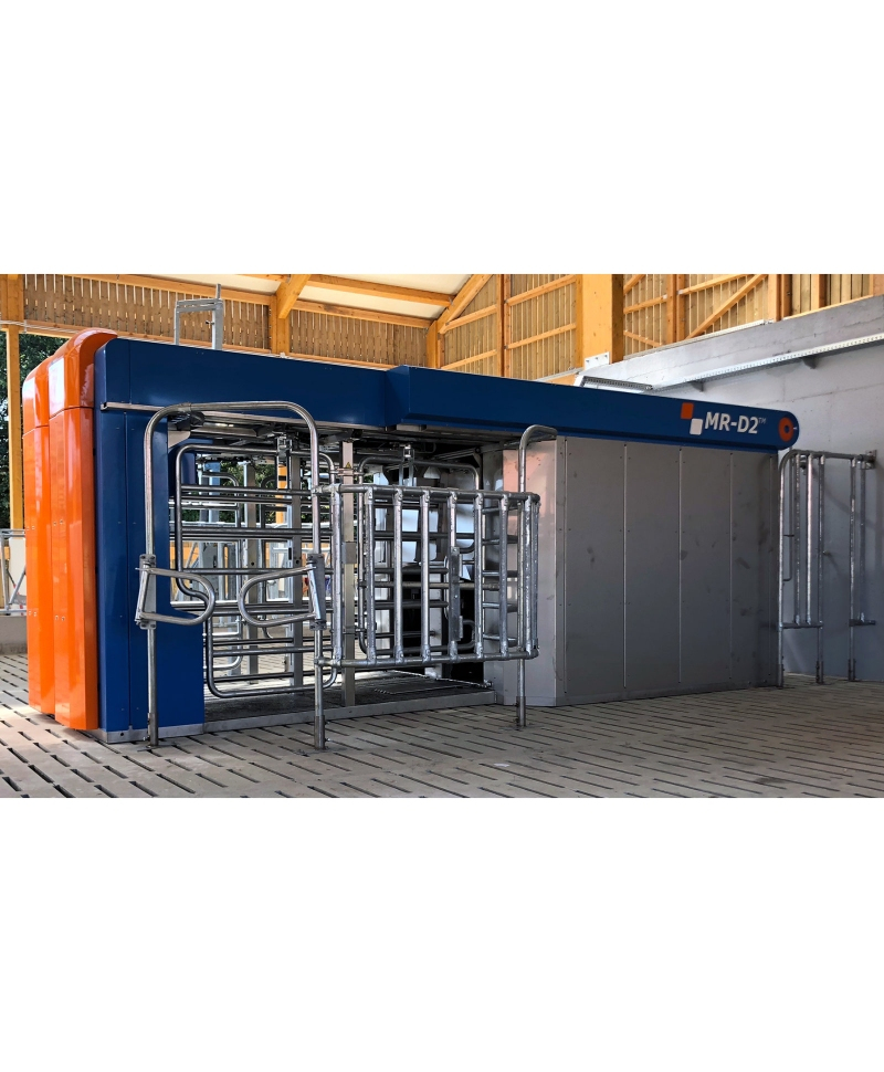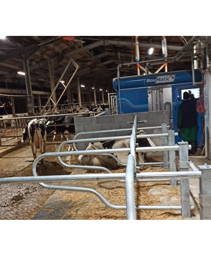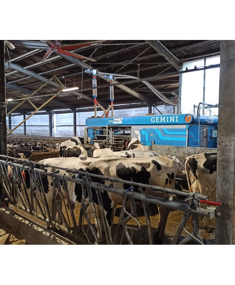 BouMatic Gemini UP este noul model de robot de muls compact cu doua boxe de la BouMatic. Sistemul e configurat sa mulga simultan doua vaci care stau una langa alta.