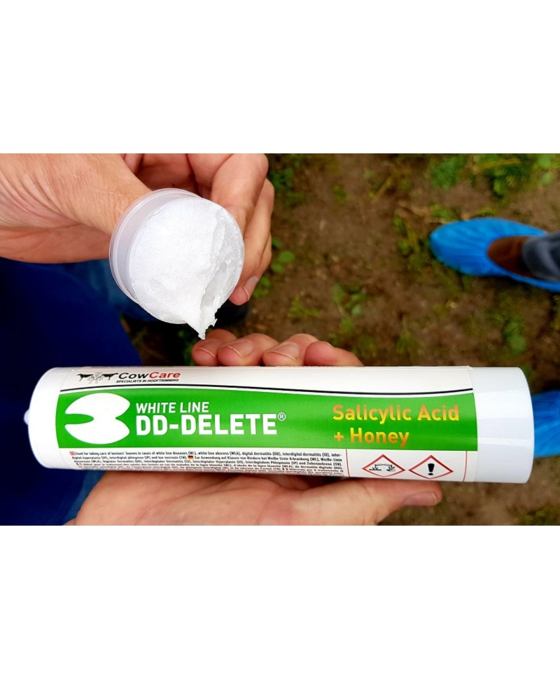 Pasta cu acid salicilic DD-DELETE White este folosita ca produs pentru ingrijire. Putem vedea o crestere in afectiunile precum dermatita digitala (Mortellaro), cresterea interdigitala, inflamarea pielii interdigitale si a altora in ultimii ani. Pentru cele mai bune rezultate posibile, DD-DELETE se aplica direct pe zona afectata. Trebuie detasata dupa 4-5 zile de la aplicarea unui bandaj peste aceasta.