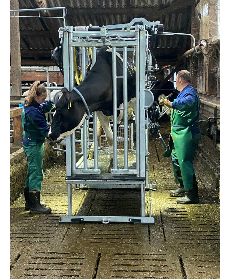 Acest model este ideal pentru fermele mari. O fixare buna si sigura a animalului face trimajul mult mai usor si placut atat pentru animal, cat si pentru trimmer. Zgomotul foarte redus de functionare a standului contribuie foarte mult la starea animalelor care urmeaza sa intre in stand si influenteaza productia imediat dupa trimaj. Toate functiile hidraulice sunt moderate si s-a acordat atentie maxima obtinerii unui design robust si sigur pentru animale si operator.