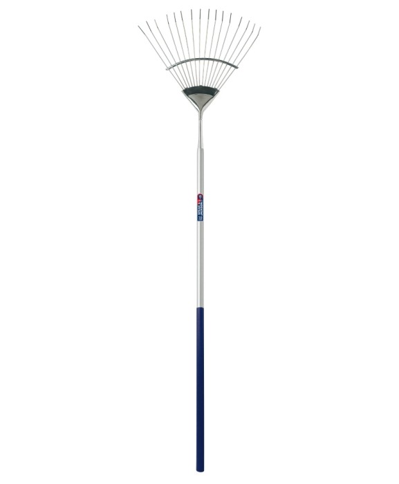 Dintii flexibili din inox sunt lustruiti si tratati pentru eficienta si aderenta minima la sol, sunt rezistenti la rugina si durabili in timp. Coada este din aluminiu, iar partea superioara a greblei este moale, acoperita cu un strat antiderapant pentru confortul utilizatorului.
